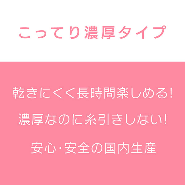 銀イオン配合で消臭・抗菌・除菌もでき、より衛生的に使用できるようになりました。こってり濃厚タイプは、乾きにくく長時間楽しめます。また、濃厚なのに糸引きしません。