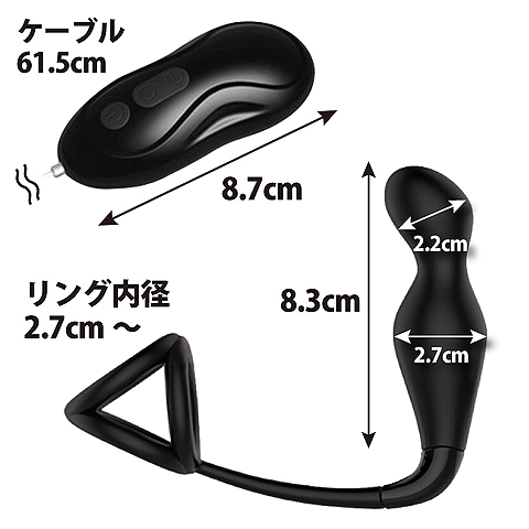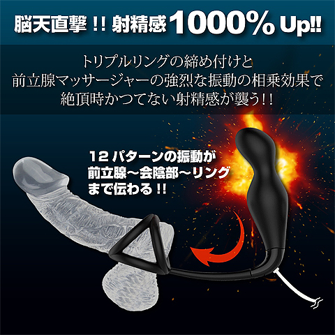 トリプルリングの締め付けとパワフルな振動による前立腺責めの相乗効果でかつてない絶頂感が味わえる、シリコン製の男性向けアナルグッズ。素材として使用しているシリコンは医療用グレードと超高品質なので、安全性が非常に高く、肌触りもシリコンならではの滑らかさなのでスムーズに挿入でき、ヘッド部分で前立腺をピタッと捉えながら、12パターンの多彩な振動で責め立てます。 しかも、前方に付いたトリプルリングでサオ、玉袋、根元の3点を締め付けて射精感をアップさせるので、普通のオナニーでは味わえない強烈な絶頂感に襲われちゃいます。 全身を稲妻が貫くような衝撃的な快感を、あなたもぜひ体感してみて下さい。