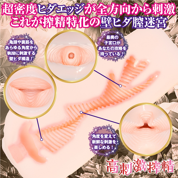 重量560グラムのボディに超高密度ヒダのランダムエッジ構造を搭載、さらに奥部分には分岐レーンを配置して複雑刺激を作り出すことで搾精特化の高刺激ホールが完成しました。