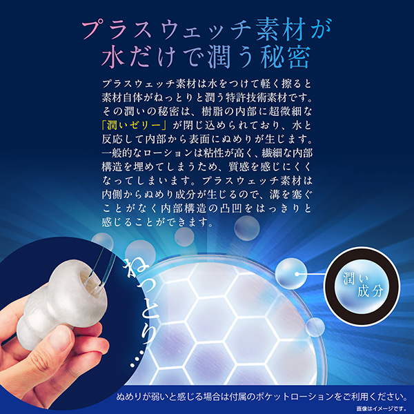 水に反応して潤いゼリーがしみ出す、特許登録済み素材「プラスウェッチ」