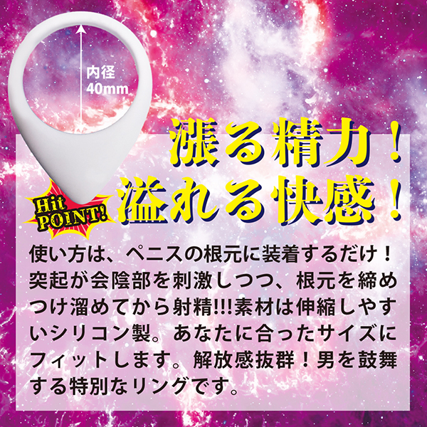 使い方は、根●に装着するだけ。根●を締め付けることでギリギリまで溜めて一気に発射!柔らかシリコン製。あなたに合ったサイズにフィット。おすすめのローションも付属しています。漲る精力で男を上げる特別なリングです。