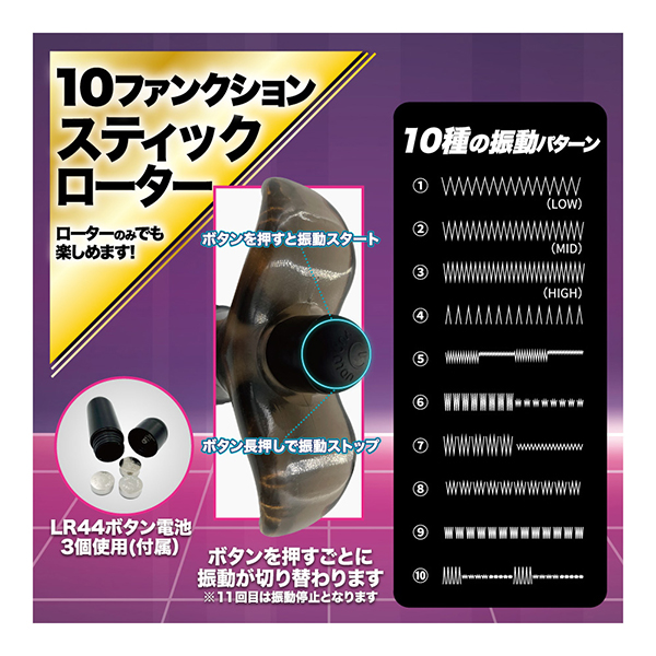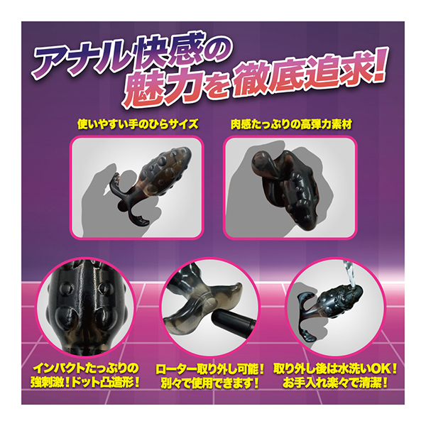 ア●ルの魅力を満足させる、美しいボディライン。その魅力をそのままに、振動を付け加えました。オンオフできるよう取り外し可能なスティックローターで、振動アクション10パターンを搭載。ローターを取り外せば、本体は丸々水洗いが出来ますので、お手入れも簡単です。