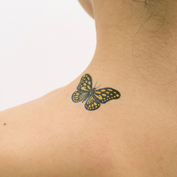 黒字に黄色い模様の艶やかな蝶々模様は、単体でも肌をキレイに魅せることができ、他の蝶々と組み合わせても良いでしょう。