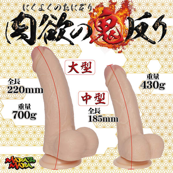 中型とはまったく異なる脅威の重量700グラム。極太の反りかえる巨根が特徴的。全長220mm、挿入長180mm、根本のサ●の太さは56mmの極太サイズ。造形はリアル系で漢が限界まで勃●した時のような、血管の浮き出るバッキバキに反り返るディルドは敏感なG●ポットに直撃し、ストレートタイプよりも肉壁がえぐられる感覚を楽しめる逸品となっております。