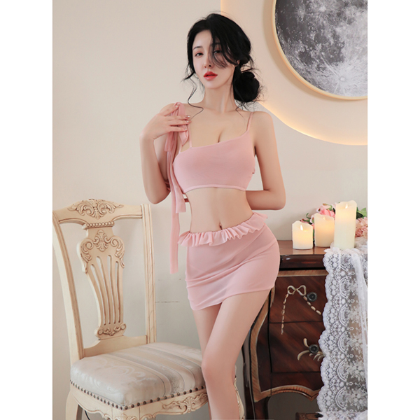 ミニスカートからのぞく脚線美は、軽やかで挑発的。トップス・ショーツ・スカートの3点セットで、可愛らしさとセクシーさを同時に叶えます。