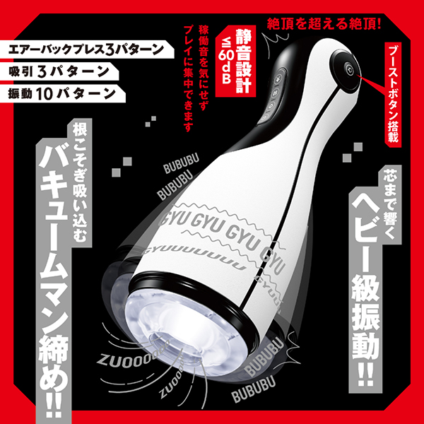 まさに、ホンモノSEX体験!両サイドのエアーバックが膨らむことで締め上げる名器ギミック!根こそぎ吸い込むバキュームフェラに、芯まで響くヘビー級振動!絶頂を超える絶頂のブーストボタン搭載!高品質エラストマー使用。