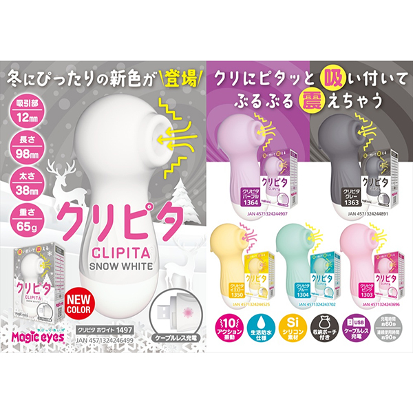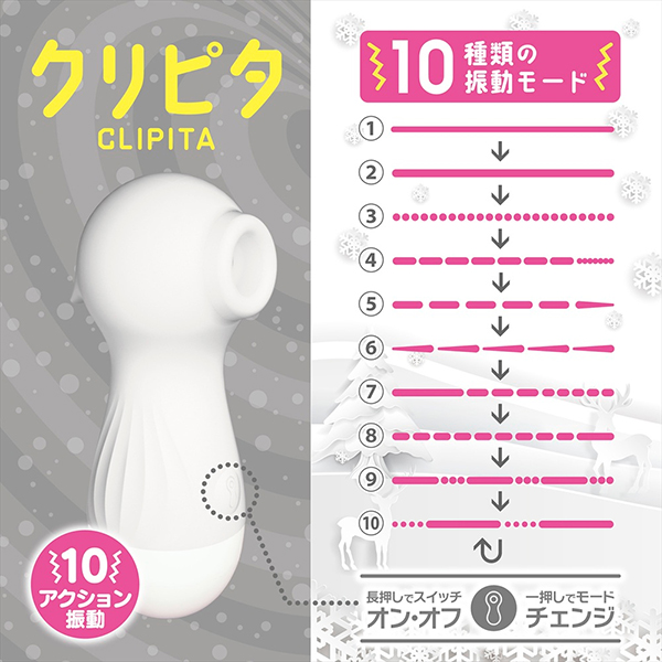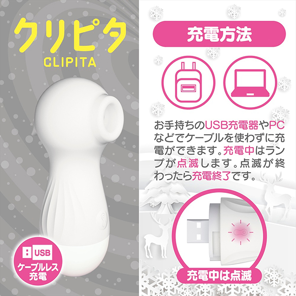 煩わしいコード要らずのUSB直充電、12mmの吸引部、10アクションの振動、素材はシリコンで収納ポーチまで付属した全6色になったクリピタをお試し下さい。