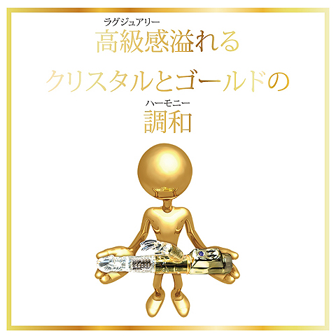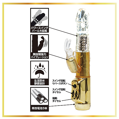 高級感溢れるクリスタルとゴールドカラーでデザインされたゴージャスなバイブレーターです。スイング機能と内蔵パールの回転、クリ責め子機の振動と、高度な機能を装備した1本型バイブレーター。 全長21.5cmとなかなか大きなバイブですが、その動作は繊細かつ強力。また、挿入部先端の直径は3cmとやや細目だから、見た目の迫力よりも意外とすんなりと挿入が可能になります。 生活防水、静音設計が標準装備されているバイブレーターなので、思いっきりプレイすることが可能です。