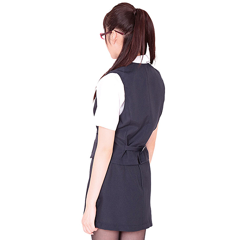 紺色ベストにスカートと、白ブラウスのオーソドックスな組み合わせが人気のコスチューム「密室秘書」
