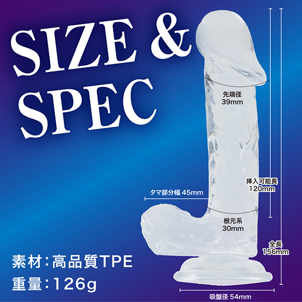 ■本体サイズ:全長156mm、挿入可能長120mm、先端径39mm、根元径30mm、吸盤径54mm