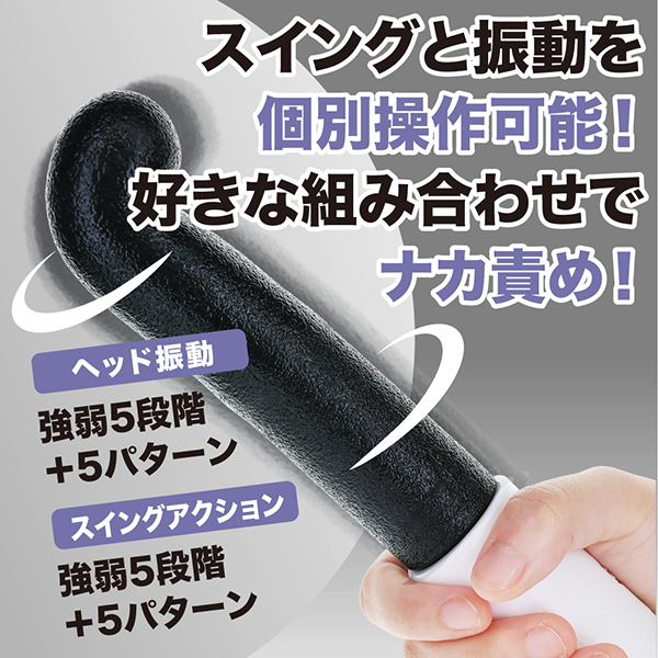 エラストマー素材に先端振動とスイング機能というシンプルな機構で少し柔らかめの素材の表面に、ローションのノリが良いザラザラテクスチャーを採用。
