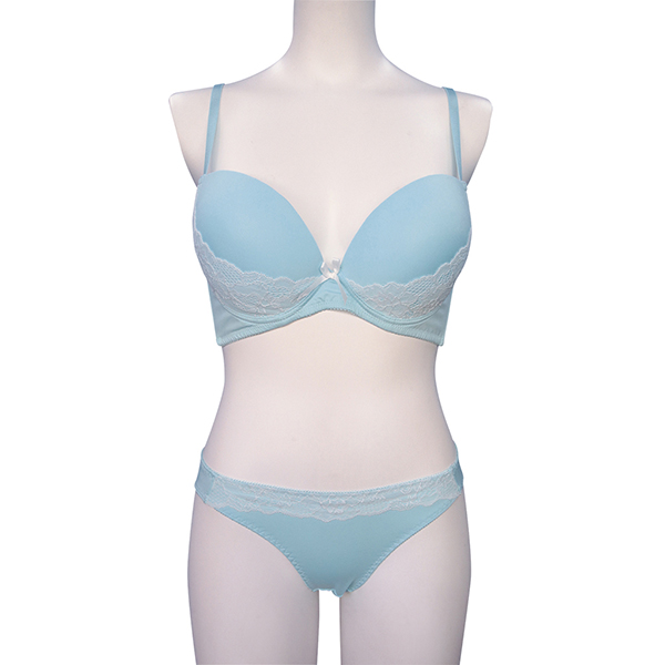 爽やかなサックスブルーをベースに、繊細なホワイトレースをあしらったキュートなデザイン。