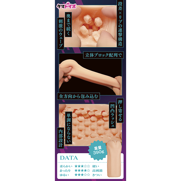 内部構造には段差とリブを組み合わせた連撃構造、奥まで続くウェーブ状の刺激を演出。