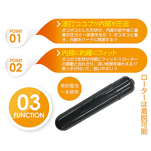波打つようなポコポコとした形状と内蔵ローターの振動によるダブルの刺激で、あなたをドライオーガズムへと導くアナルグッズ。弾力があって柔らかな素材できていて先端から徐々に太くなっていくので、スムーズな挿入が可能で、根元の部分がリング状の取っ手になっているので抜き差しがしやすくなり、中に入り過ぎてしまうのも防いでくれるので安心です。 そして、スッポリ飲み込ませると、中央の太くなった部分が前立腺をピタッと捉え、団子のようなポコポコ形状と内蔵ローターの強力振動でハードに責めて、ドライオーガズムを誘発します。 ローターは取り外しが可能なので、ボディ部分が丸洗いできて、常に清潔な状態を保っておくことができます。