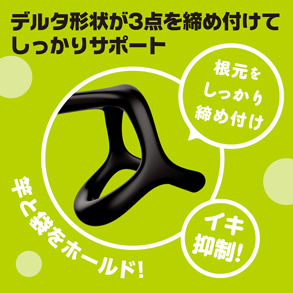 超!ぷにっとりんぐから、竿と根元をしっかりサポートするリングが登場。根元を3点で締め付けるデルタリング!竿をしっかり締め付けるリングでイキ抑制!サッと装着♪ピタッと密着!はずれにくい弾力性、臭いのない高品質シリコンでしっかり締め付け、着けてるストレスを軽減!