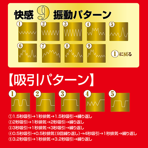 【振動】電源/振動ボタン長押しでON・電源/振動ボタンをプッシュで振動パターンが1(電源投入時)→2→3→4→5→6→7→8→9に順番に変わります。(電源ON時は1から始まります。9の次は1になります。)