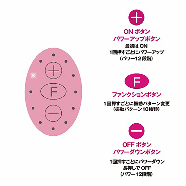 リズミカルな振動を楽しみたい方は真ん中のFスイッチ! バラエティに富んだ【10種類の振動パターン】を楽しめます。
