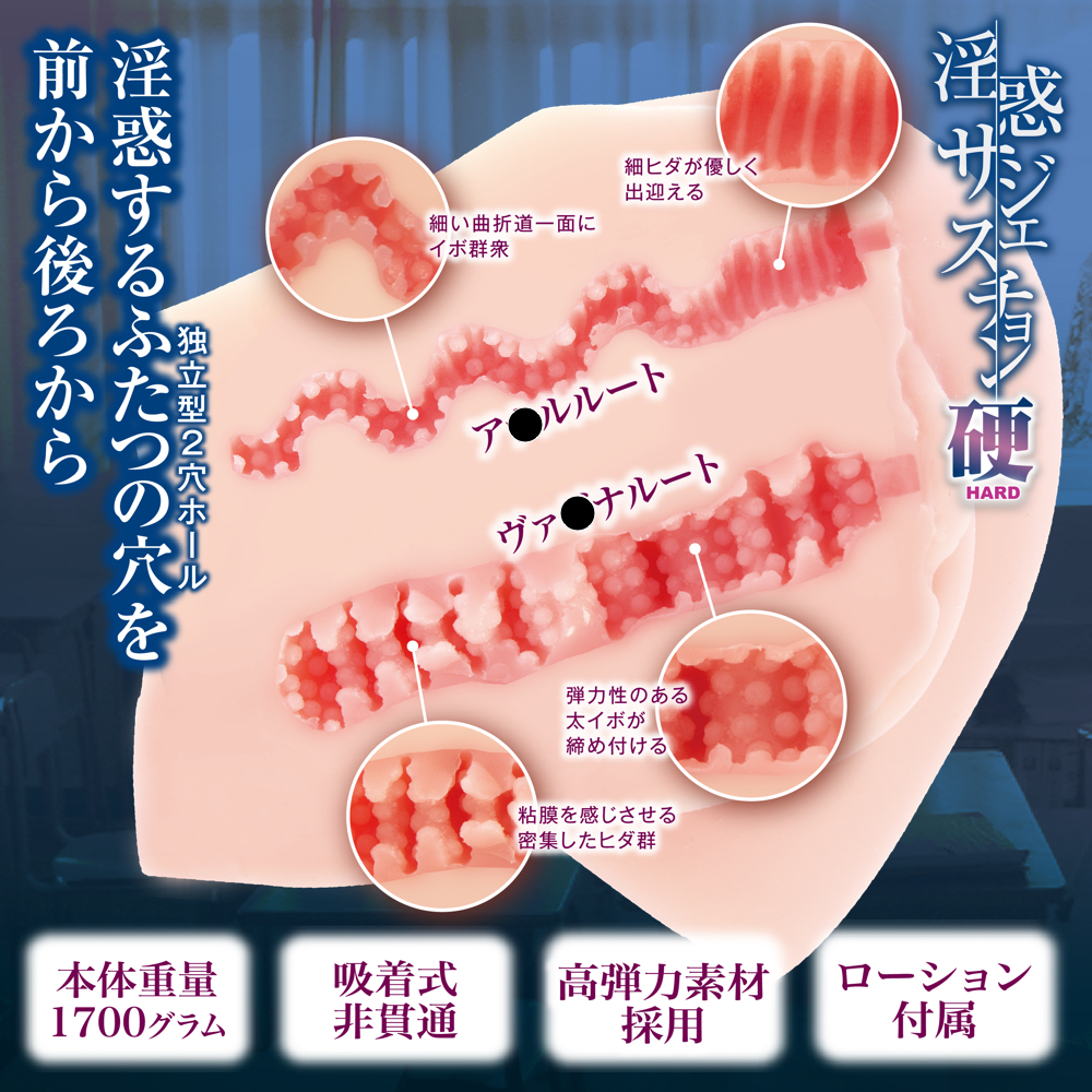 ホールは特色の違うヴァ●ナとア●ルルートの2種類を実装。非貫通のバキュームもさらにアップ。個性の異なる4種類の刺激ポイントにより、多彩な感触の2穴を前から後ろからお楽しみいただけます。造形は、早熟女子のボディフォルムをイメージして生。キュッと上がったヒップ、くびれたウエストなどリアルな外観は視覚的にもご満足いただけます。