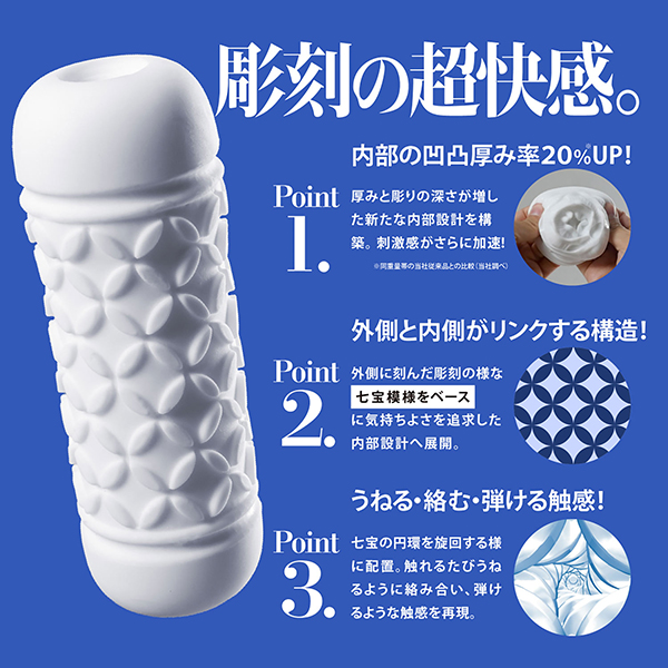 内側では 旋回する七宝構造が絡みつくように連動し、外側のデザインと響き合いながら、途切れのない締め上げ感で深い快感をもたらします。