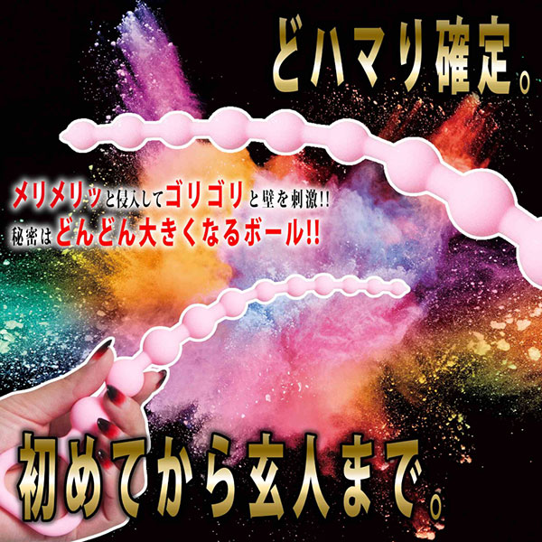 直径0.7cmの小玉から始まり、最大1.8cmの玉まで、11個の玉が繋がります。小さい玉から順番に調教していってください。