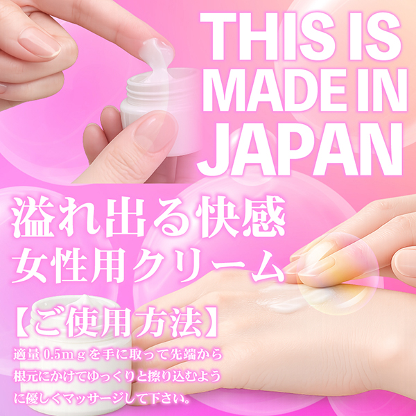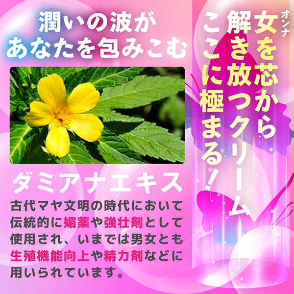 官能的な高まりをサポートするダミアナエキスを中心としてダイズ種子エキス、ヒメフウロエキス、ワイルドタイムエキスと温感成分を配合したクリームに、南アフリカ伝承の抗酸化・血流促進に優れたルイボスエキス、肌再生と鎮静の万能ハーブのツボクサ葉/茎エキス、血流促進とリラックス効果のユズ果実エキス、保湿感抜群のツバキ種子油の女性に優しい美容サポート成分を追加し、官能と美容を同時にサポートするクリームです。