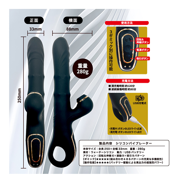搭載されるギミックは、なんと3タイプ!回転&伸縮ギミックに、振動ギミック、そして吸引ギミック!