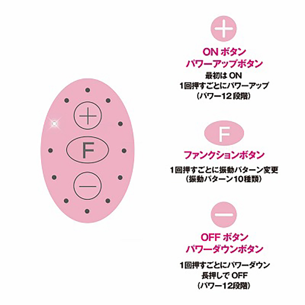 リズミカルな振動を楽しみたい方は真ん中のFスイッチ! バラエティに富んだ【10種類の振動パターン】を楽しめます。