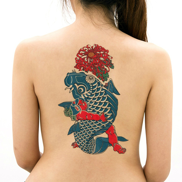 朱色の大きな菊の花と、鮮やかなブルーの鯉にまたがった金太郎の模様は、完璧な構図ですよ。