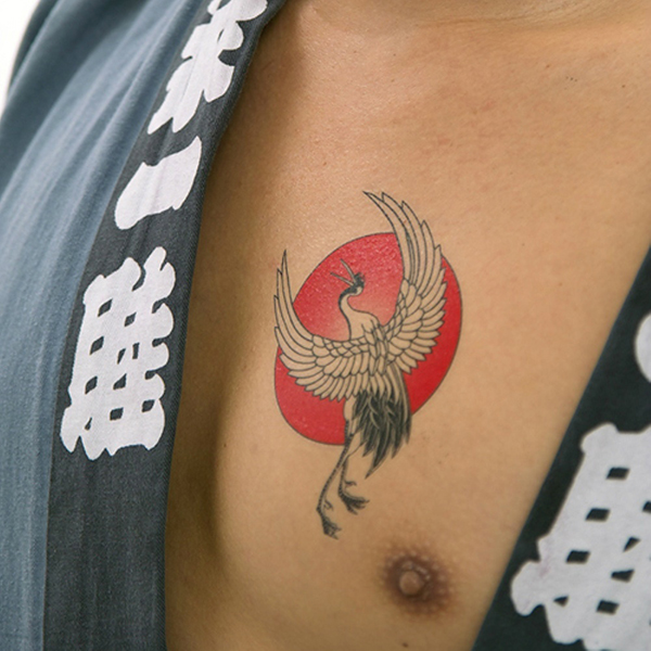 真っ赤な月を背景に、大きな翼を広げて飛び立つ鶴の模様は、とても縁起がよく、日本的な模様といってよいでしょう。