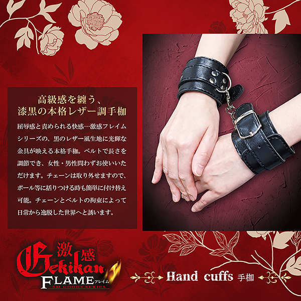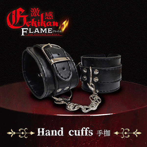 屈辱感と責められる快感…激感フレイムシリーズの、黒のレザー風生地に光輝な金具が映える本格手枷。