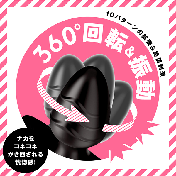 ゆっくり馴染んでしっかり拡張!!超強力な回転&振動の拡張特化で極イキ仕様!ツルンと簡単挿入フォルム のタマゴ形状プラグ!ナカをコネコネかき回される恍惚感!10パターンの拡張&絶頂刺激の360°回転&振動ギミック!強力重厚モーター内蔵で芯から震える重くて強い振動が楽しめます。