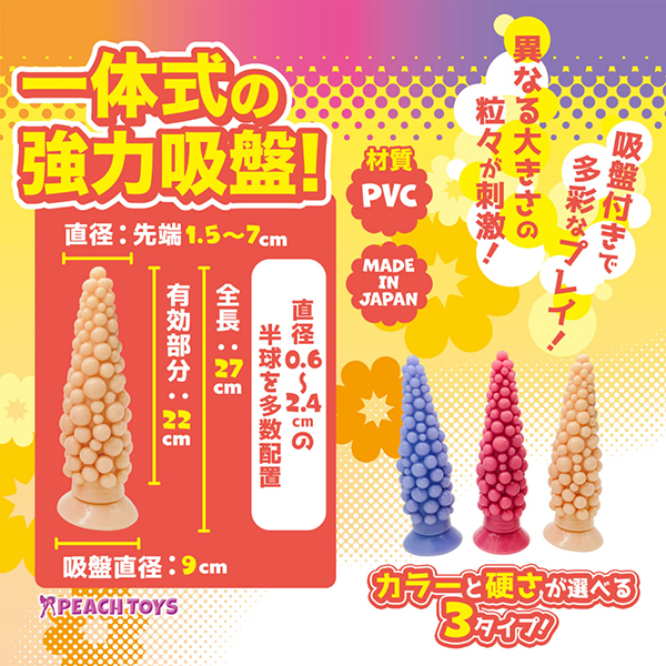 ●異なる大きさの粒々が刺激!全長27㎝の巨大ディルド。先端は小さく、段々と広がる円錐形状に大きさの異なる粒々がランダムに配置!(直径0.6㎝~2.4㎝の半球を多数配置)