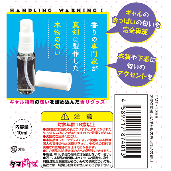 ギャルのおっぱいの匂いを完全再現 リアルな匂いに大興奮!! 匂いで感じる新感覚 あのとき感じたあの匂いをもう一度 ギャル特有の匂いを詰め込んだ香りグッツ 女性フェロモンたっぷりの淫臭!! 衣装や下着に匂いのアクセントを 内容量10ml 香りの専門家が真剣に製作した本物の匂い リアルな匂いの為取扱注意!