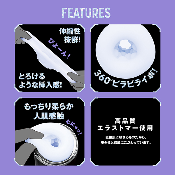 直接肌に触れるものだから、安全性と感触にこだわり高品質なエラストマーを使用しています。伸縮性抜群の柔らか素材が吸い付きながら絡みつく粘膜刺激!もっちり柔らか人肌感触の挿入口はリアルを超えた幸福快感!竿部分をダイレクトに刺激する360°ビラビライボの敏感刺激!最先端技術によりコンパクトなのにパワフル&多機能!