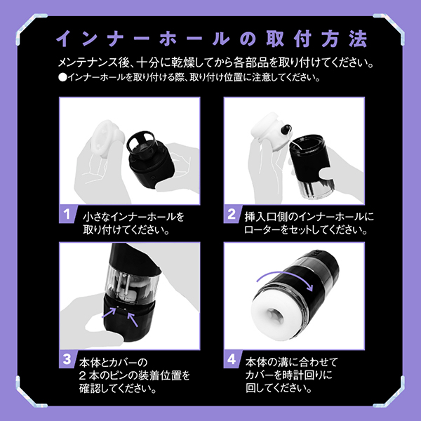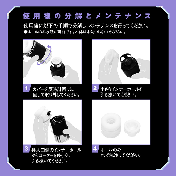 初心者にも使いやすい電動ホールです。シンプルな3つボタンで片手でも操作が可能です。インナーホールを取って洗うだけなので、後処理も超簡単です。重量約360gで手持ち操作も楽々です。