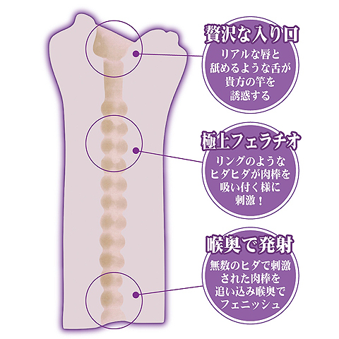 そして、奥までびっしりと並んだリング状のヒダヒダが、肉棒全体に吸い付くように刺激しながら奥へ奥へと誘い込み、最後には喉奥にたっぷりと放出する快感が味わえます。