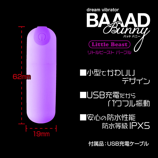 女性の好みを追求し誕生したバッドバニー・シリーズ。今度はかわいいデザインとパワフルな振動のミニサイズ・ローターが登場。女性の「欲しい」を形にしました。このリトルビーストはかわいくパワフルなローターです。女性の好きなカラーで展開し、持っているだけで満足できるデザインに仕上げました。またソフトな肌触りと10種類(3段階の強弱と7パターンの振動)の振動を装備し、機能面でも充実しています。充電は付属のUSBケーブルで簡単・便利。使用後は水洗い可能な防水機能(IPX5)も完備し、清潔さを保ち続けます。可愛らしくてパワフル、安心の防水性能(IPX5)と充実のローター・バッドバニーリトルビースト。女性へのプレゼントにもオススメです。