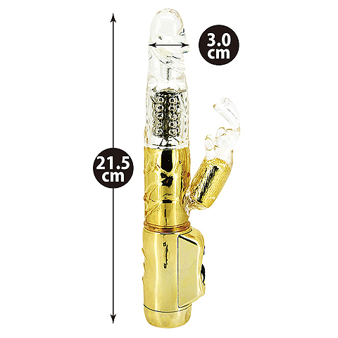高級感溢れるクリスタルとゴールドカラーでデザインされたゴージャスなバイブレーターです。スイング機能と内蔵パールの回転、クリ責め子機の振動と、高度な機能を装備した1本型バイブレーター。 全長21.5cmとなかなか大きなバイブですが、その動作は繊細かつ強力。また、挿入部先端の直径は3cmとやや細目だから、見た目の迫力よりも意外とすんなりと挿入が可能になります。 生活防水、静音設計が標準装備されているバイブレーターなので、思いっきりプレイすることが可能です。