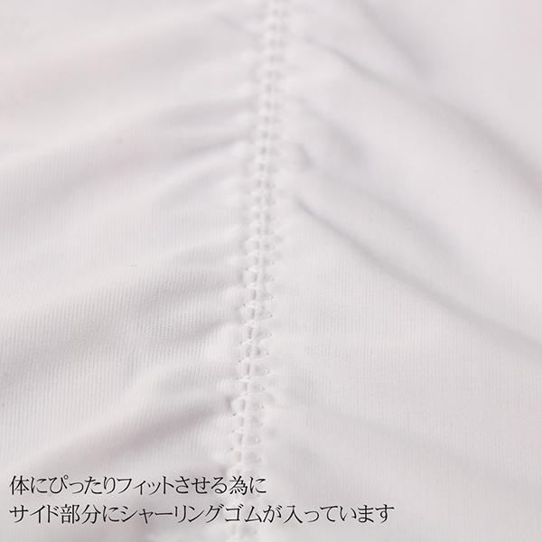 サイドにシャーリングゴムを入れる事で、体にぴったりフィットしてボディラインを美しく魅せるデザインになっています。