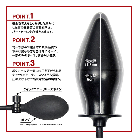 男性女性を問わず、そして、アナルでもヴァギナでもググッと広げられる感覚を楽しむことができる、プラグ型のエアポンプ式拡張グッズ。