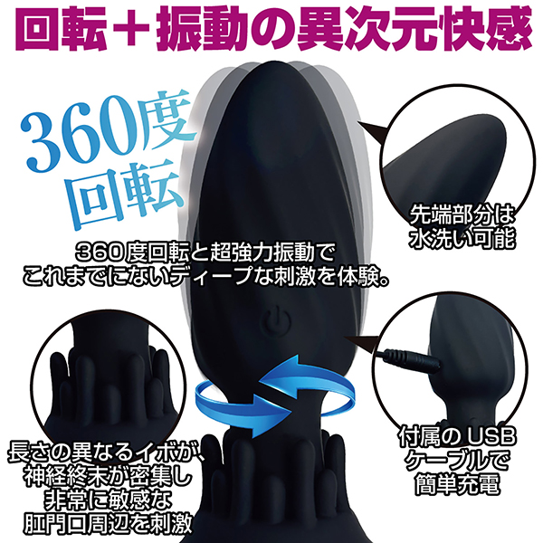 強力モーターによる10種の振動パターンと、ヘッド360度回転機能を搭載しており、プラグ特有の密着感とあいまって強烈な快感を体験できます。