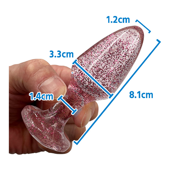 ラメ入りがとってもキュートなキラキラ系アダルトグッズ、「ラメ入りア●ルプラグ」!気分はまるでパーティー♪透明ボディの中には、キラキラのラメがみっちり入りました。眺めているだけで楽しくなる可愛いアイテムです。本体素材には、魅力を高めるアクリル樹脂を使用しました。アクリル樹脂は、ガラスのような透明さをもちながらも、優れた耐衝撃性で割れにくいのが特徴です。耐水性もあるので、水や汚れに強く、メンテンナスの簡単さもポイント。さらには、カチカチの高硬度タイプ。柔らかいア●ルプラグには無い、自己主張の激しい刺激にきっと魅了されるはず。キュートな見た目とは裏腹に、ハードなア●ルプレイをお楽しみください。「Mサイズ」は、全長94ミリに太さ32ミリのミドルサイズ。ステップアップを目指す方や、拡張に挑戦したい方などにオススメです。