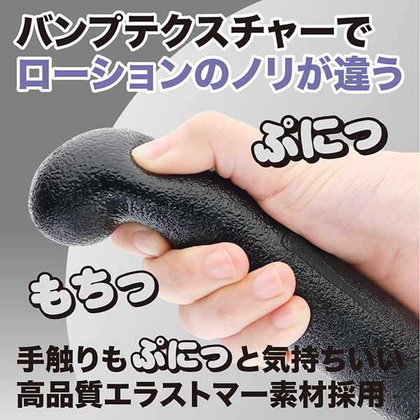 エラストマー素材に先端振動とスイング機能というシンプルな機構で少し柔らかめの素材の表面に、ローションのノリが良いザラザラテクスチャーを採用。