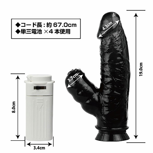 更に大型子機が連動しクリを強刺激!最大経4.3cmの極太×高弾力×肉厚の、正に雄牛のように力強く押し上げ、そそり立つ漆黒バイブを咥えてしまったら、もう普通サイズでは満足できない…。