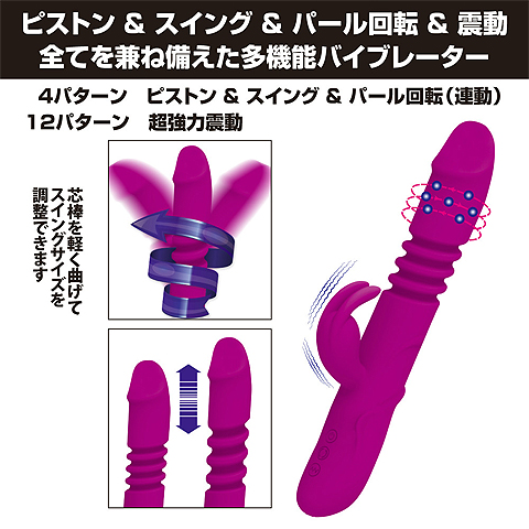 回転しながら突きまくる、まるでドリルの様な超パワフルな刺激を楽しむことができるバイブレーター。本体側は上下ピストン、スイング、内蔵パールの回転という3つの機能を備えているので、4種類のパターンで奥までガンガン突かれながら膣内を同時にグリグリと掻き回されちゃう、強烈な刺激を味わうことができます。 さらに、ウサギ型の子機も可愛い見た目からは想像もつかないなかなかの攻撃力で、大きな耳でクリを挟むように捉えながら、12パターンの強力な振動で責め立ててきます。 もう普通の刺激じゃ物足りない、という方に、ぜひお試し頂きたいバイブです。