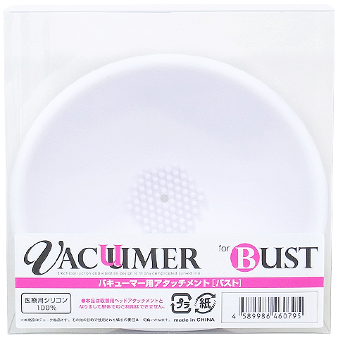 吸引と振動の同時刺激で究極の快感が味わえるローター「バキューマー」の取替用アタッチメント「バキューマー用アタッチメント バスト」。バストの曲線にフィットする様に設計されているのでしっかりとした密着感で、医療用シリコン素材を100%使用しているので体に優しく、安心、安全。本体に取り付けて使用することでバストを強力に吸引し、内側に付いたブラシ状の突起が細かな振動で乳首を刺激して、強烈な快感をもたらします。取り替えるだけで別の快感が楽しめちゃう、「バキューマー」ユーザーにはぜひ抑えて頂きたいアイテムです。